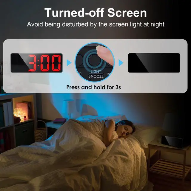 Press and hold "LIGHT/SNOOZE" button for 3s, the screen will light off totally to avoid disturbance. Press any button to exit this mode.