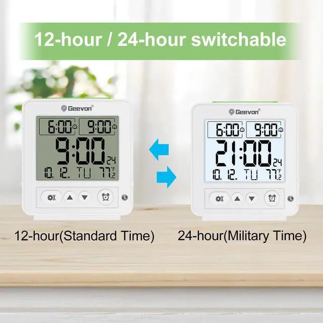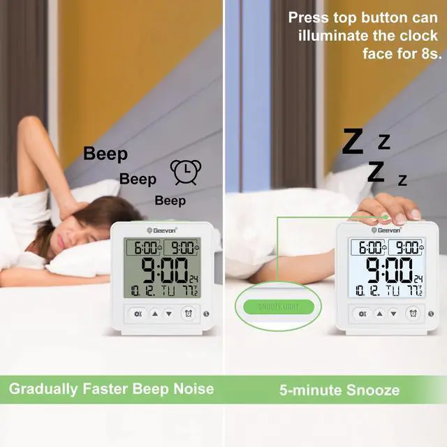 Dual Alarms & Snooze FunctionWhen the alarm goes off, this dual alarm digital clocks will send out a gradually ascending "beeping" noise which continues for 2 minutes to wake you up. Perfectly designed for heavy sleepers. Before the alarm stops itself, touch the "SNOOZE" button to get an extra 8-minute nap