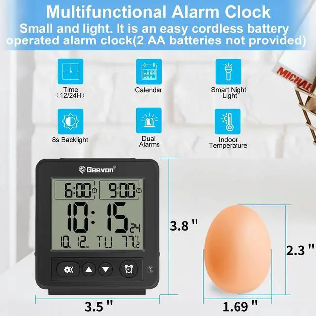 Dual Alarms & Snooze FunctionWhen the alarm goes off, this dual alarm digital clocks will send out a gradually ascending "beeping" noise which continues for 2 minutes to wake you up. Perfectly designed for heavy sleepers. Before the alarm stops itself, touch the "SNOOZE" button to get an extra 8-minute nap