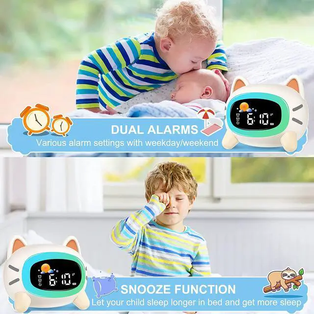 Sound Machine-Dual alarms and snooze modes, 12/24 hour format, 4 levels of adjustable volume. Provides 6 types of wake up sounds. Distinguishable weekday/weekend to avoid your child waking up from a sweet weekend slumber. Meanwhile, the kids alarm clock provides 7 sleep sounds with rhythmic and calm background music to provide better sleep for kids, which can be timed from 0-60 minutes.