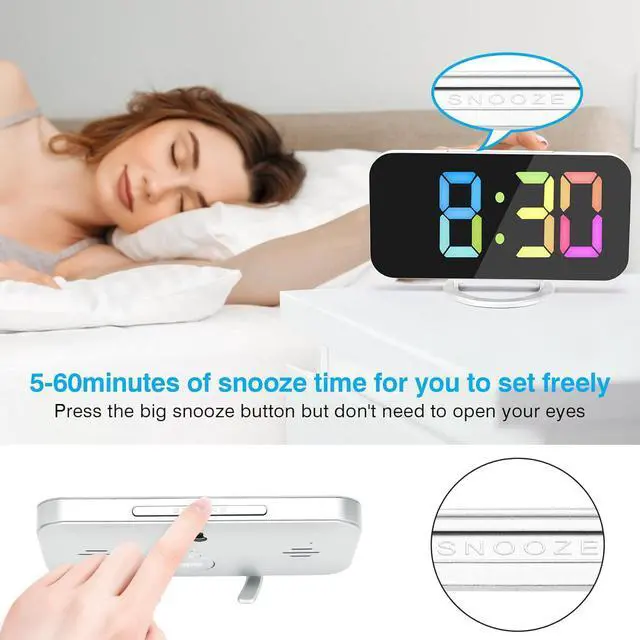 3: Snooze Function--Big snooze button helps you to easily turn off the buzzer without opening eyes, and get extra 5 minutes sleep, but simultaneously prevent oversleeping. The digital clock will alarm every 5 minutes until you turn off the snooze mode by pressing any other buttons, perfect for heavy sleepers.