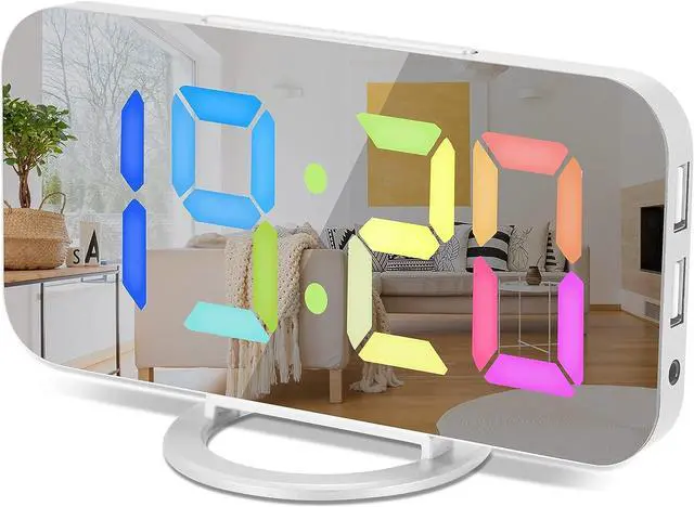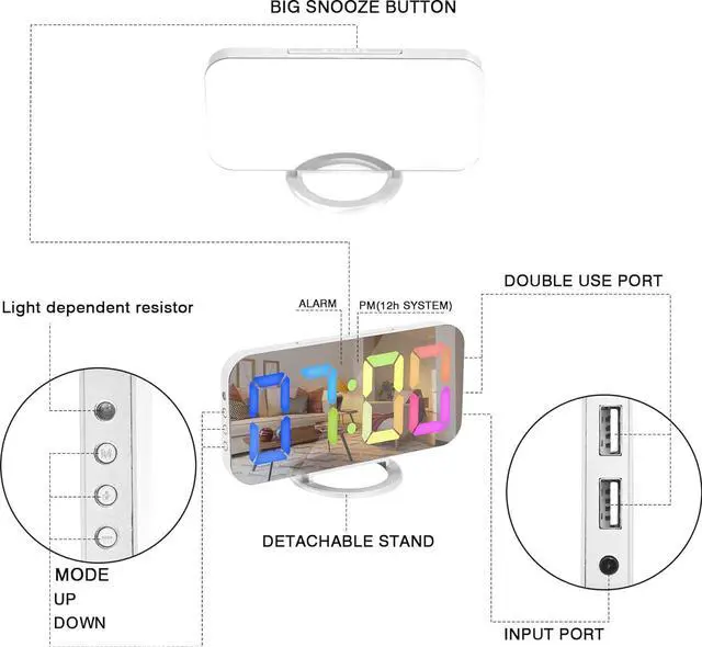 1: Unique Mirror Large Display Design-- 6.1" inch ultra-large LED display, you can see the time clearly even at a glance within 30 feet of your bedroom, and the display is also can be used as a mirror in daily use, simple and interesting.