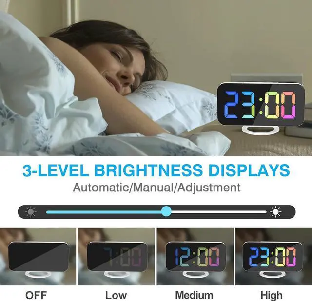 2: Adjustable Brightness & Night Mode--The digital alarm clock provides 3-level brightness, adjust by manual or auto to a comfortable brightness and the LED light will automatically dim during your sleep time to protect your eyes at night and save energy. No blinding lights or any annoying sounds disturb your sleep, create an peaceful environment for sleep.