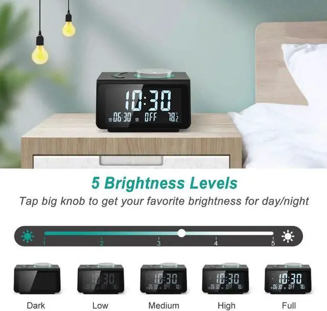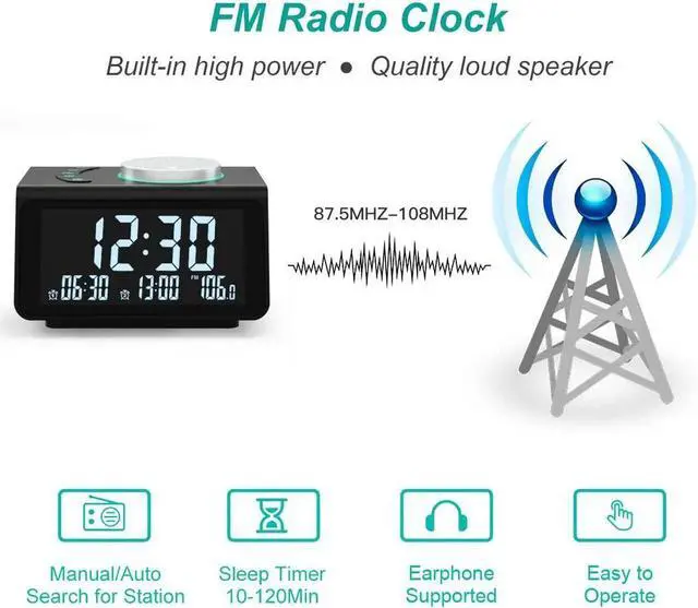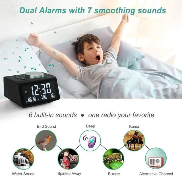 Our Digital Alarm Clock has 6 fixed ringing music sounds (Bird, Water, Kanoon, Spirited Away, Beep and Buzzer) you can choose, whats more, you can also set your favorite radio stations as the 7th alarm sound, it must be a wonderful moment to hear your favorite anchors voice and wake you up in the morning.
