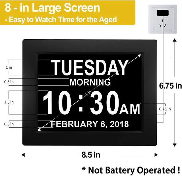 Large Screen Display- 8" High Resolution Digital Alarm Clock clearly spells out the time, date, month. It' s clear enough to look at the time far away. -*** The clock is not battery operated. ***