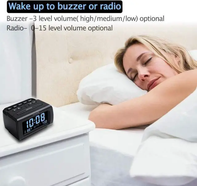 Adjustable Alarm Sound and Snooze: Wake up to buzzer or radio should your preference. Both alarm sound volume can be adjusted to your comfortable level. (buzzer: 3 level, radio: 1-15 level). The alarm will begin sound faintly then increases to its max within 5 seconds. 8 minutes interval snooze can be repeated in one hour until turning off.