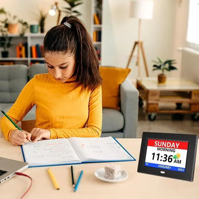 Read: The digital clock for elderly has a 7-inch display that clearly displays the time, date, day of the week, four time periods of the day [morning, afternoon, evening, night], and displays the ICONS of each time period, non-abbreviated large font helps the elderly easily read the time.