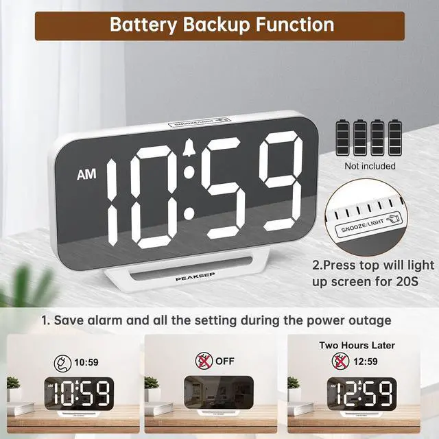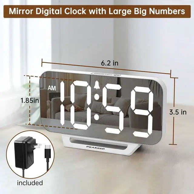 : Peakeep alarm clocks boast a sleek and stylish white casing, complementing any home office décor or bedroom desk accessories. The minimalist aesthetic desktop stand makes the clock remains stable and prominently visible at all times. The modern mirror-like clock face not only adds a touch of elegance but also ensures time is legible from a variety of angles.