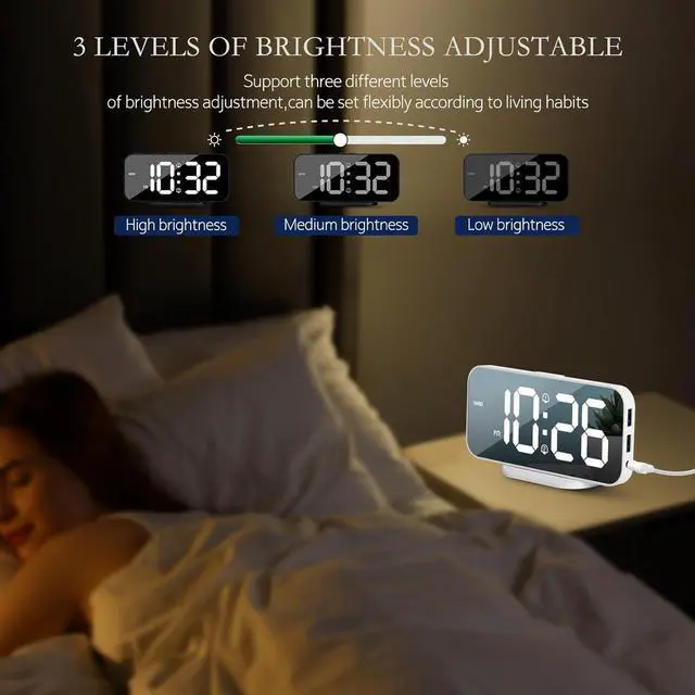 Brightness AdjustableThere are 3 kinds of brightness options for bedside clocks, high brightness, medium brightness, low brightness. Press the " SNOOZE" button for 3 seconds to enter the night mode setting. After opening, the clock will automatically adjust the brightness to the lowest from 6.00 pm- 6.00 am every day.