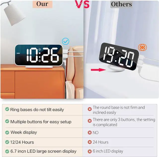 HD Digital Large Display 6.7 inch LED mirror display, this clock has a large digital so it can be seen across the room. Besides the display, the buttons are clearly labeled and intuitive. With the ring base design, the alarm clock can stand firmly on the table without leaning easily.