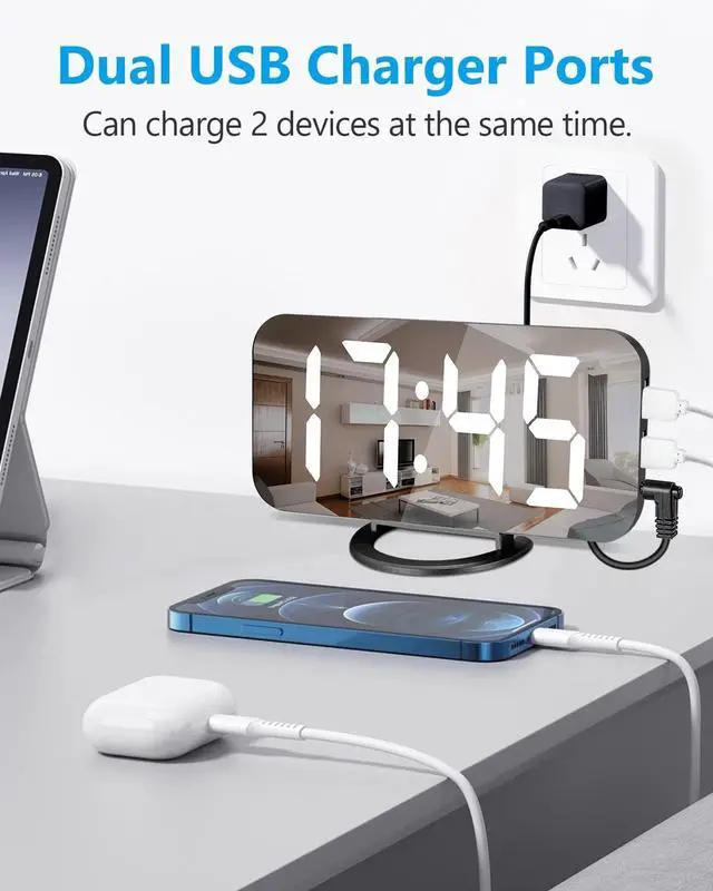 Dual Usb Charging Ports + Power-Off Memory Mirror clock uses DC-5V/1A USB power supply, with 2 USB ports, which can charge your mobile phone, tablet; Modern clock is equipped with CR2016 battery, when the alarm is disconnected When the USB power supply, you can continue to keep the alarm data.