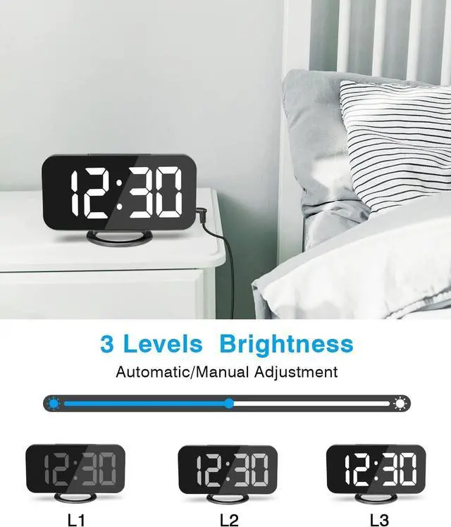 Snooze Mode + Night Mode USB clock snooze button is located on the top of the clock and can be easily turned off, allowing you to get 5 to 60 minutes (settable) of extra sleep time; night mode means that the LED automatically enters the lowest brightness display state at night, don' t affect your sleep.