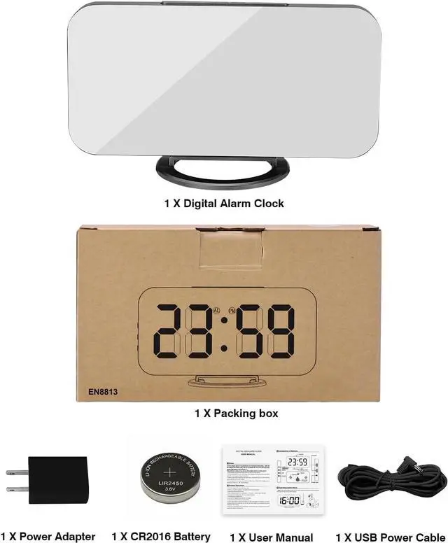 You wil get: 1 x digital alarm clock + 1 x power adapter + 1 x USB charging cable + 1 x product manual ( if you are not satisfied with any of our products, please contact us by email, we will provide solutions within 24h. )