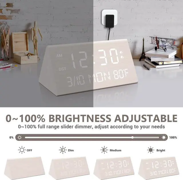 5 Level Brightness Adjustable alarm clock- Compared with the alarm clocks on the market that only have three levels of brightness adjustment, this wooden alarm clock is upgraded to 5-level dimming. Customers can adjust the brightness to 5 percentile0, 20%, 40%, 60%, 80%, 100%, which solves the problem of too bright display at night and helps you fall asleep better.