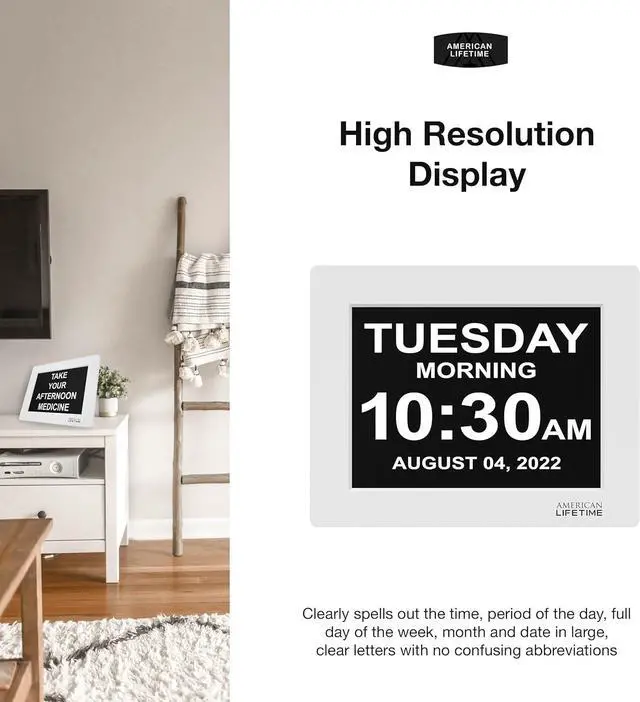 Customizable alarms: The American Lifetime dementia clock for seniors extra large offers multiple alarm options, allowing individuals to set reminders and up to 5 daily alarms for important events, such as taking medication or appointments.
