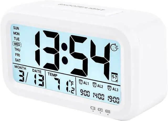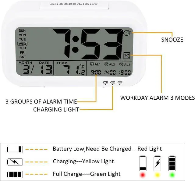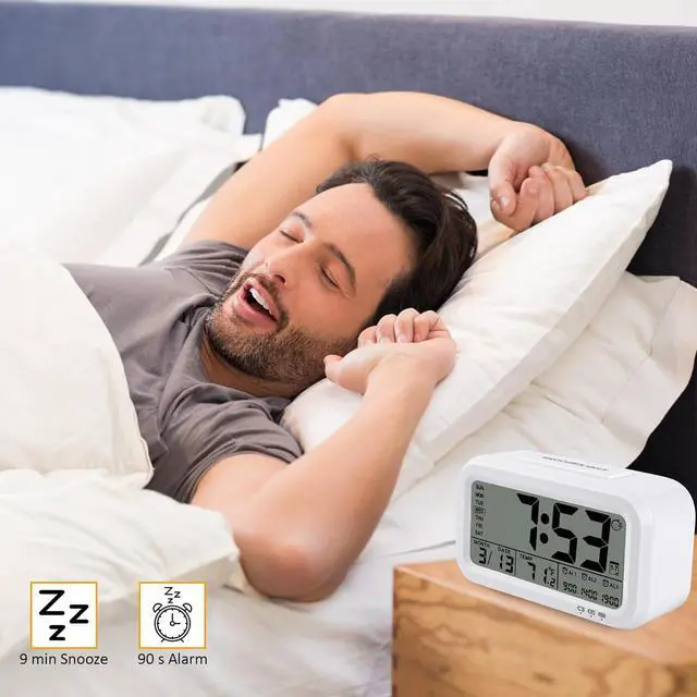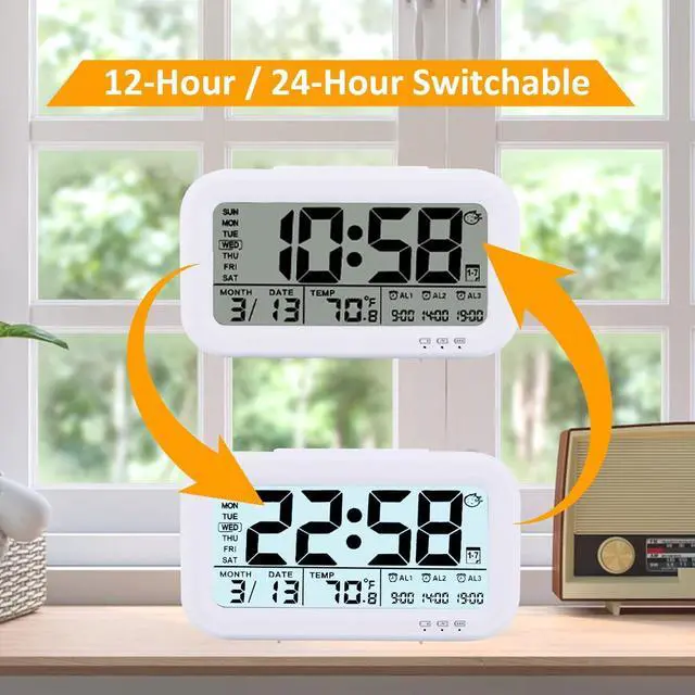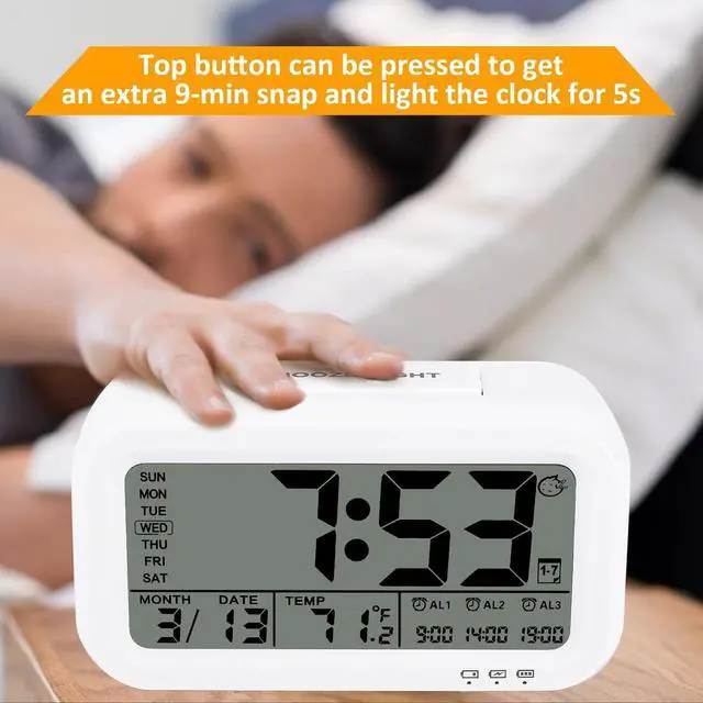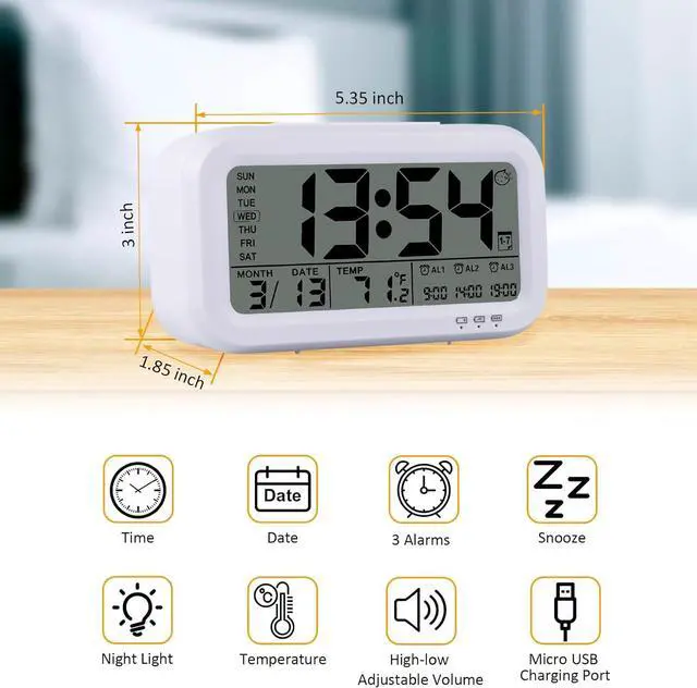 4.3 " Large Display Smart Digital Alarm Clock: 4.3 " x 2" large display, bold typeface, big numbers display time, Easy to read, with Clock, Night light, Snooze, Alarm, Smart light, Date, Temp, Calendar, Week, clear and comfortable visual sense.