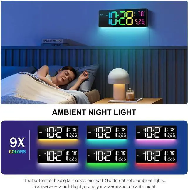 Ambient Night LightThe bottom of the digital clock comes with 9 different color ambient lights. It can serve as a night light, giving you a warm and romantic night. It is a simple and elegant artwork that decorates your room.