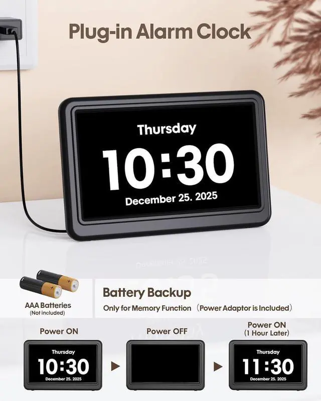 HD Display & Larg FontThe features a 7-inch 1024x600P HD LCD display that clearly displays the TIME, DATE, DAY of the WEEK, six time periods of the day[ MORNING, NOON, AFTERNOON, EVENING, NIGHT, MIDNIGHT, BEFORE DAWN ], and displays the ICONS of each time period in a bright Sun Moon visuals, ensuring that elderly individuals can easily understand the time & date.