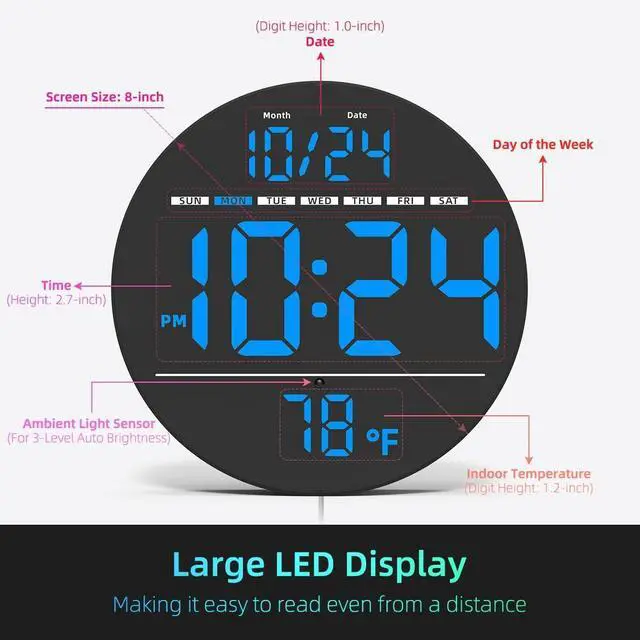 [8-INCH LARGE LED DISPLAY] -- Features a full screen with up to 2.7 -inch big time digits, making it easy to read even from a distance. This is especially beneficial for individuals with visual impairments.