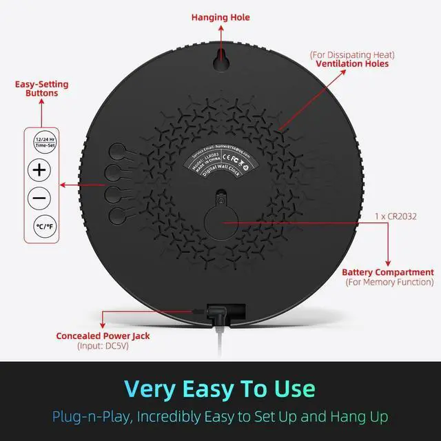 [EXTREMELY USER-FRIENDLY] -- This plug-in wall clock is incredibly easy to set up, and the 10Ft long USB Cable allows you to hang it wherever you desire.