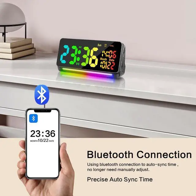 RGB Digital Display This bluetooth alarm clock loud features a digital display with 6 regular colors and 4 dynamic RGB colors. You can choose different colors for the digits based on your preferences and needs, allowing the clock to match your style and showcase your unique taste and personality.