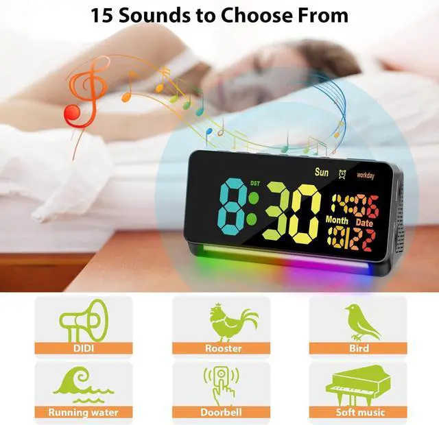 15 Wake-Up Sounds- Our lound alarm clock for heavy sleepers adults offers you 15 different wake-up sounds, catering to your preferences for various music styles, rhythms, or sounds, ensuring you wake up in the morning the way you like.