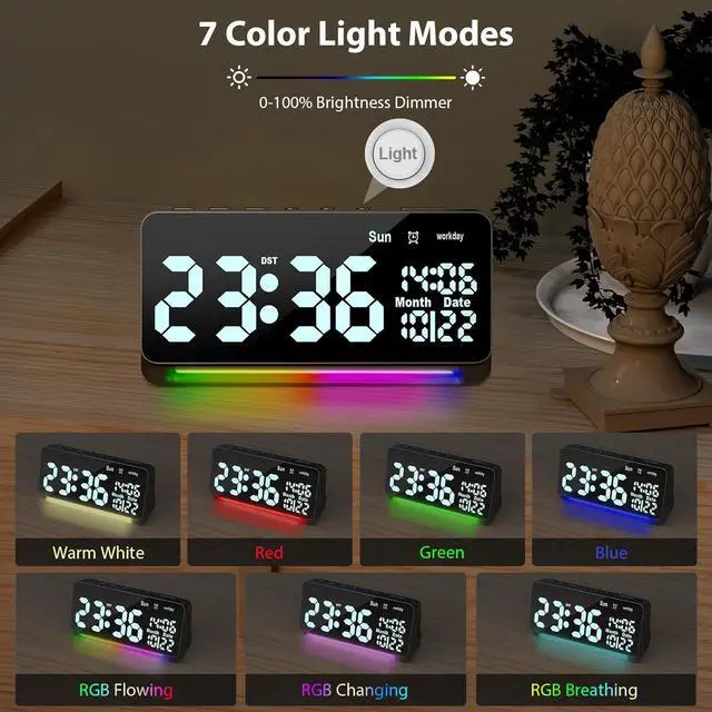RGB Night Light This night light digital alarm clock for heavy sleepers features 4 solid color lights and 3 dynamic, colorful ambiance lights. The adjustable brightness ambiance light can be used as a night light, providing a soft and comforting light in the darkness to help you fall asleep and relax your mind and body.