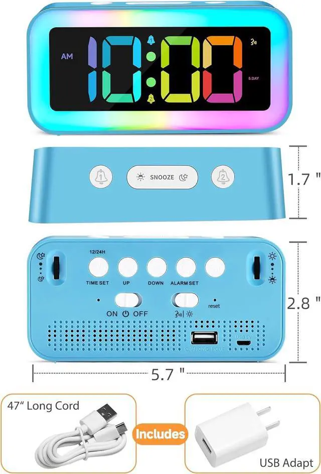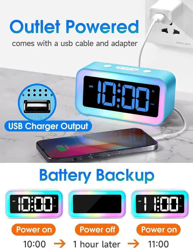 Alarm Clock with USB Charger: Features a USB charger port supporting DC 5V/1A output for convenient charging of electronic devices
