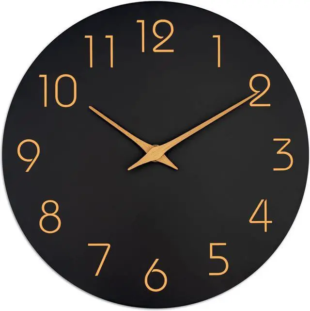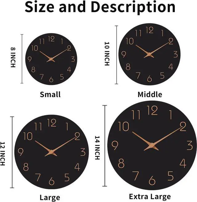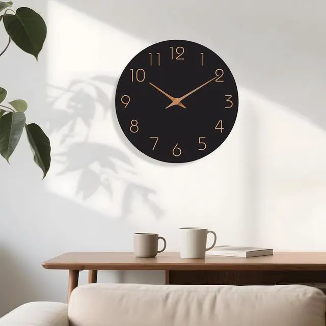 Simple design: Made of black MDF clock face and rose gold Arabic numbers, khaki wooden hour and minute hands, no second hand, no frames and no glass.