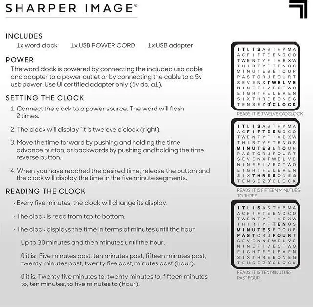 USER-FRIENDLY SETUP & OPERATION: Quickly power on your LED Word Clock using the provided USB cable and adapter, and effortlessly set the time in five-minute increments with intuitive advance and reverse buttons.