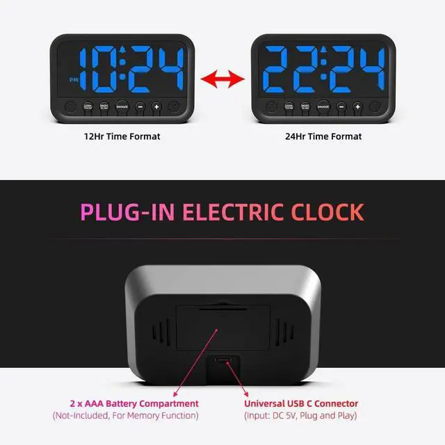 PLUG-IN ELECTRIC CLOCK WITH MEMORY FUNCTION The electric alarm clock features a widely used USB C connector for universal compatibility, and the 2xAAA battery-backup function ensures that time and settings are preserved in case of a power outage.
