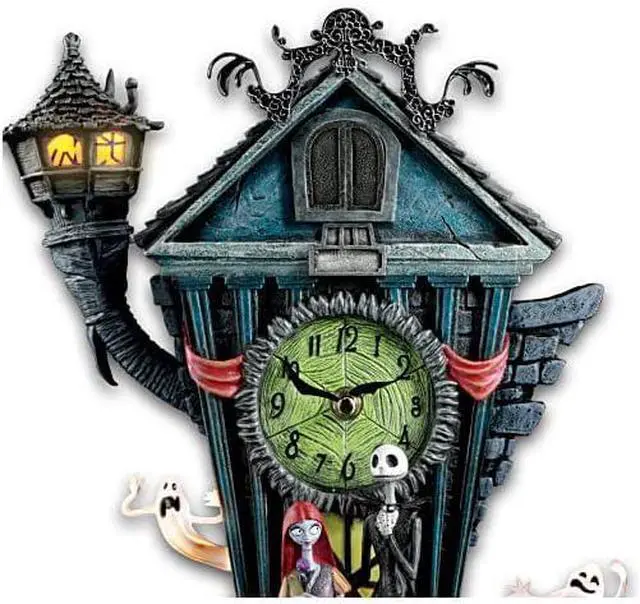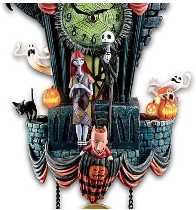 DIMENSIONS: Impressive 21-inch high cuckoo clock featuring detailed sculptural design inspired by Tim Burton' s The Nightmare Before Christmas