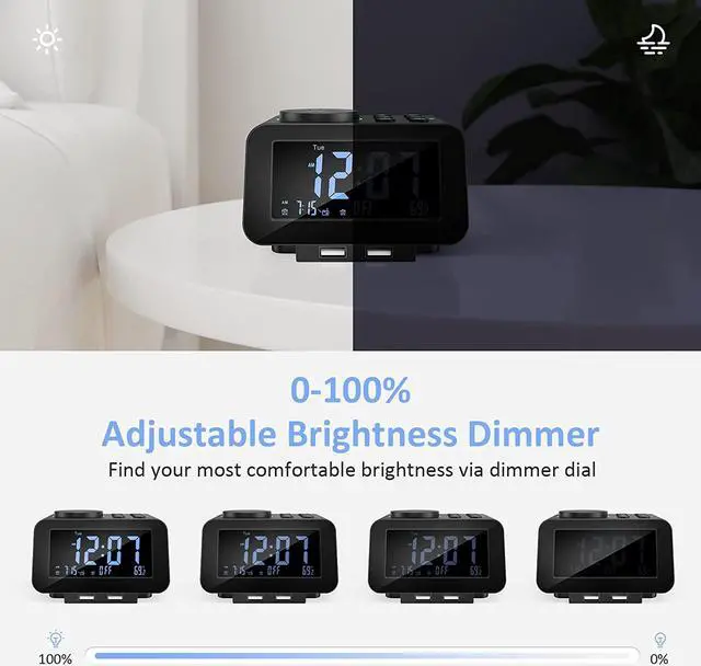 FULL DIMMABLE DISPLAY - The brightness of the 3.4 -inch compact LCD is dial-controlled and adjustable from 0 to 100%, from cast-no-glow at midnight to bright enough that the time can easily be read from across the room during the day. Other features displayed on the screen include: day, 12 or 24hr mode, temperature (°F or °C), status and ringtone for alarm 1 and 2.