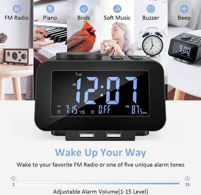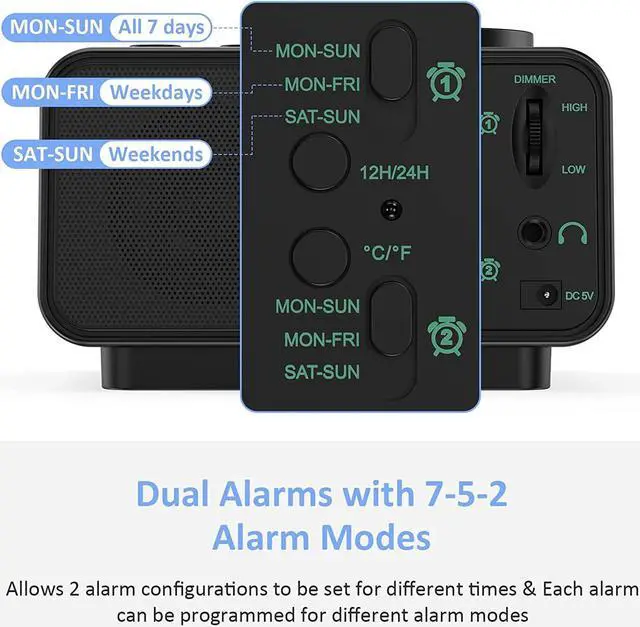 CUSTOMIZABLE ALARM - Dual alarms with separate weekend/weekday/all-7-day mode satisfy the needs of everyone and every family. You may choose one of the 5 built-in tones (Beep/Piano/Buzzer/Bird/Soft Music) or radio as wake up sound, which gradually increases in volume from gentle to the level you set (options from level 1 to 15). Snooze allows extra 9 minutes of slumber.