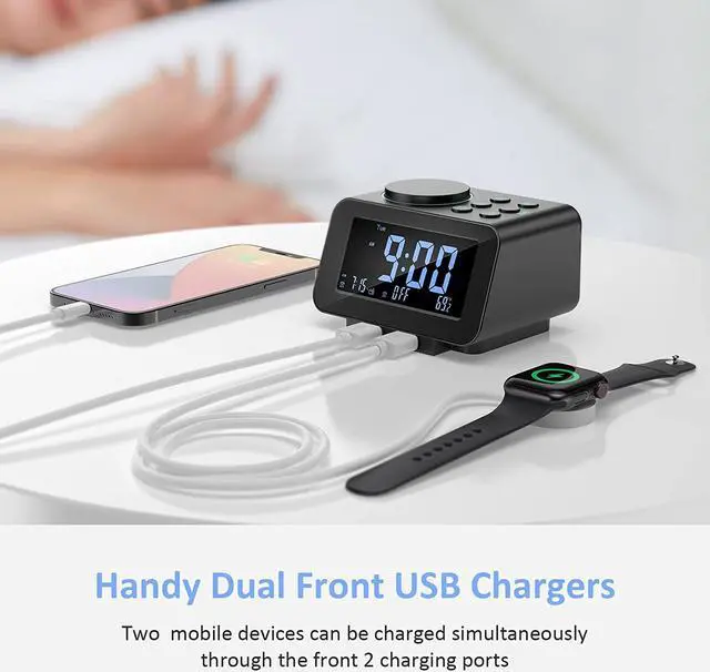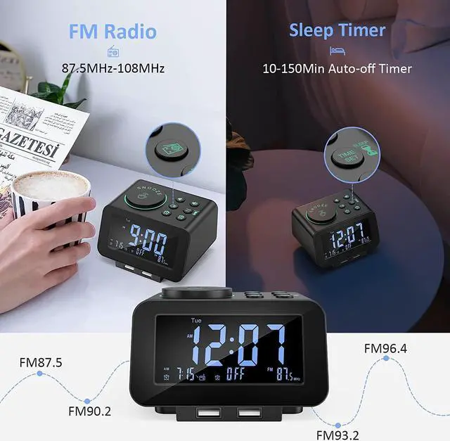 MORE THAN JUST AN ALARM - FM radio saves up to 40 stations, and the sleep timer function (10-150min) offers the luxury to fall asleep with your favorite station playing. 3.5 mm headphone jack comes handy not disturbing others nearby. 2 USB ports will charge your phone or other mobile devices while you sleep. (Headphones and charging cable NOT included).