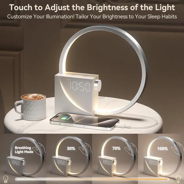 ASTHETICALLY BEDSIDE NIGHT LIGHT WITH ADJUSTABLE DIGITAL LIGHT: In addition to sounds, the vivilumens alarm clock night light also provides a soft warm night light with 3 brightness levels and 1 breathing night light and 4 levels softy adjustable digital display light. Perfect for middle-of-the-night bathroom trips without waking up fully.