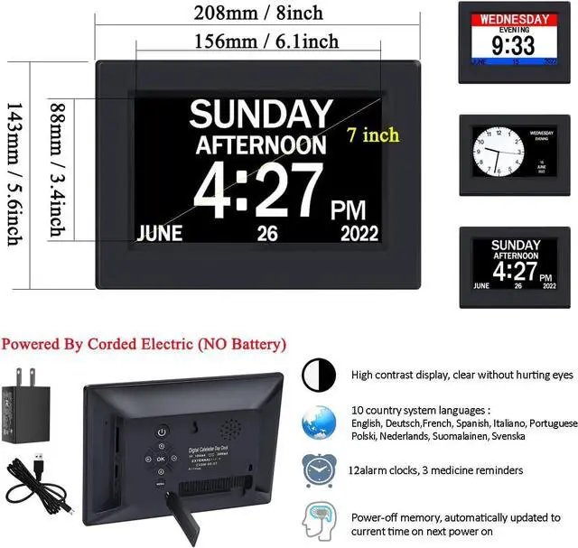 Multi-Displays: Elderly Clock, Wall Clock and Colorful ClockWith 3 displays, each display meet the needs of different people: Elderly Clock is specially designed for our elderly, with [large non-abbreviated font] [Date, Year, Month and Time]display, which is convenient for the elderly to read; Wall Clock, which can display the time at the same time as the living room decoration, very beautiful; Colorful Clock is a color display, suitable for young and small children
