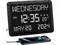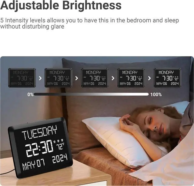 11.5E xtra Large with 5 Intensity Levels------Time, date, week and indoor temperature in large, clear white letters on the black display, Highly Visible for Memory Loss, the elderly and the impaired vision, can easily read it from anywhere in your whole living room without putting glasses on. 5 brightness Levels allows you to have this in the bedroom and sleep without disturbing glare.