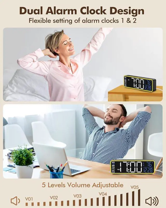 Dual Alarms: Set two separate alarms for different wake-up/work times
