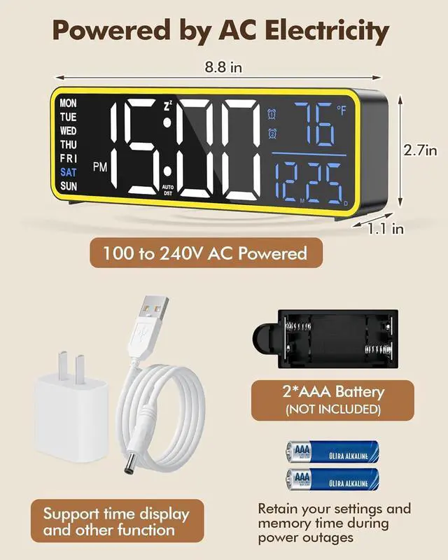 The LED digital clock is AC or USB powered and comes with a power adapter, 6.6 ft power cable, hanging nails and measuring ruler are also provided