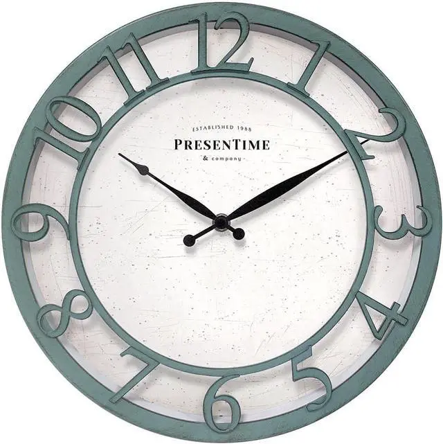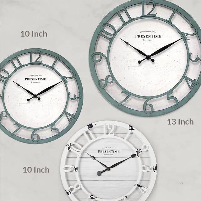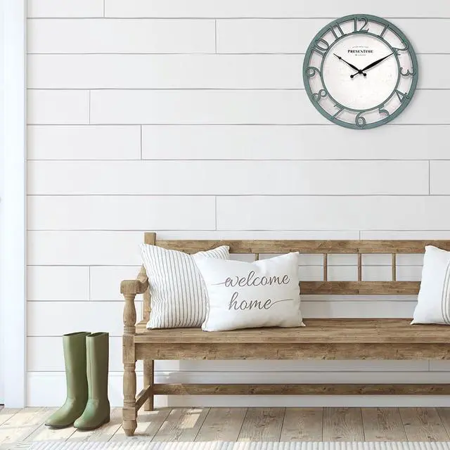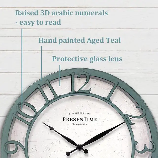 Farmhouse Style: Specially sprayed & hand-painted aged teal finish frame with shiplap style clock face design and 3D large Arabic numerals. This clock is a perfect addition to any modern or rustic décor.