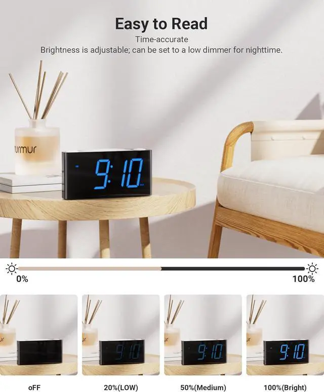 Adjustable 0-100% Brightness & 12/24h Customization- You can adjust the brightness of the display to your preferred level, whether you prefer complete darkness or a subtle glow. The sliding button allows for a seamless adjustment, making it easy to customize the brightness according to your preferences. You can also easily set the 12/24 hour display and DST adjustment to suit your needs.