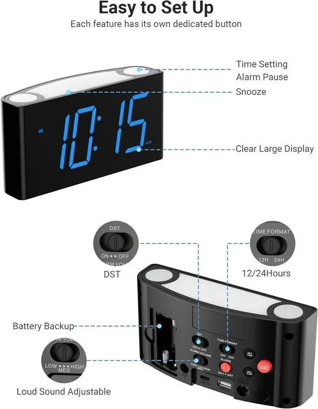 Loud Alarm Clock For Heavy Sleepers with Volume Control- The alarm buzzer volume for this beside clock could be adjusted from Low-Medium-High level which is perfect for heavy sleepers or hearing impaired. Compact size alarm clock for bedroom, office and kitchen.