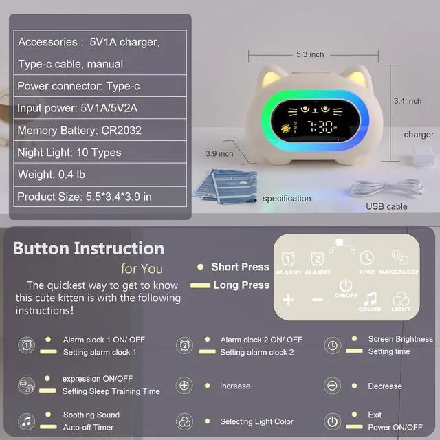 Magic Night Light Alarm Clock for Kids: Unleash the magic of dreams with our alarm clock with light. Its night light transforms bedrooms into mystical realms-ten modes of Light. Watch as a mystical cat casts spells of comfort and adventure. A new journey begins every nightright from the comfort of your childs bed. Sweet dreams are made of a simple kids alarm clock.