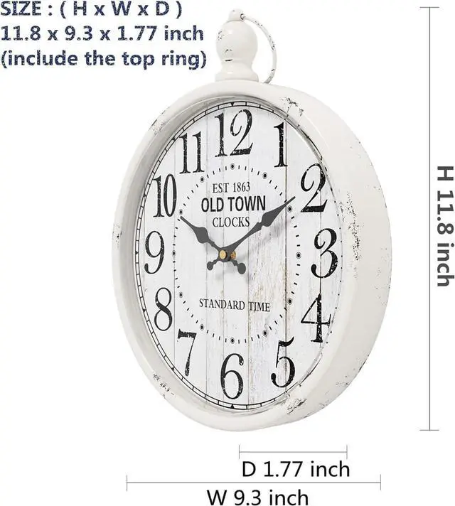 ROUND WALL CLOCK SIZE: ( H x W x D ) 11.8 x 9.3 x 1.77 inch (include the top ring) with Retro effect, old-fashioned Antique design vintage craftsmanship style, giving a nostalgic or retro decoration feel, It is a perfect gift for family or friends.
