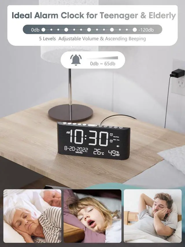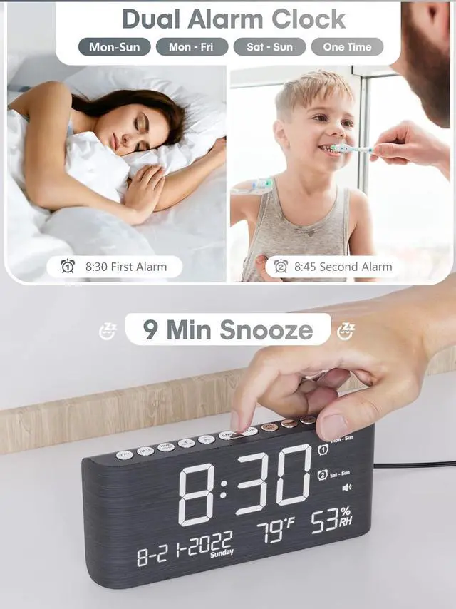 Dual Alarms with 4 Mode Options: Customizable alarm settings of the digital clock meet the wake-up needs of each individual and different family members. You can set 2 separate alarms in 4 modes of Weekdays, Weekdends, Everyday and One Time to wake up different family members, or you can get a second reminder that it' s time to go to work or school.