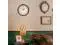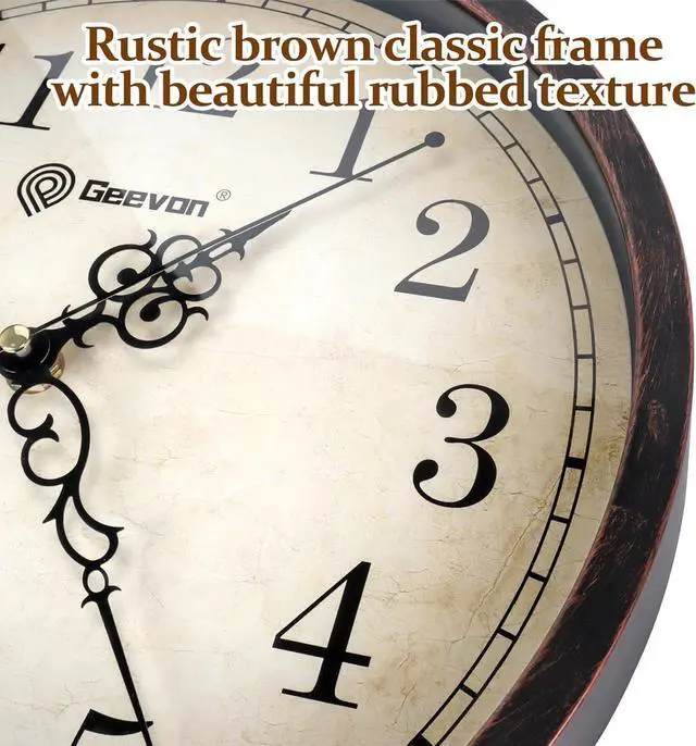 Vintage Look Geevon 14 inch kitchen wall clock round in shape, Large black bold Arabic numbers against a light parchment-inspired background creates easy viewing. Rustic brown classic frame with beautiful rubbed texture. Works with rustic, retro, traditional, classic and vintage décor styles