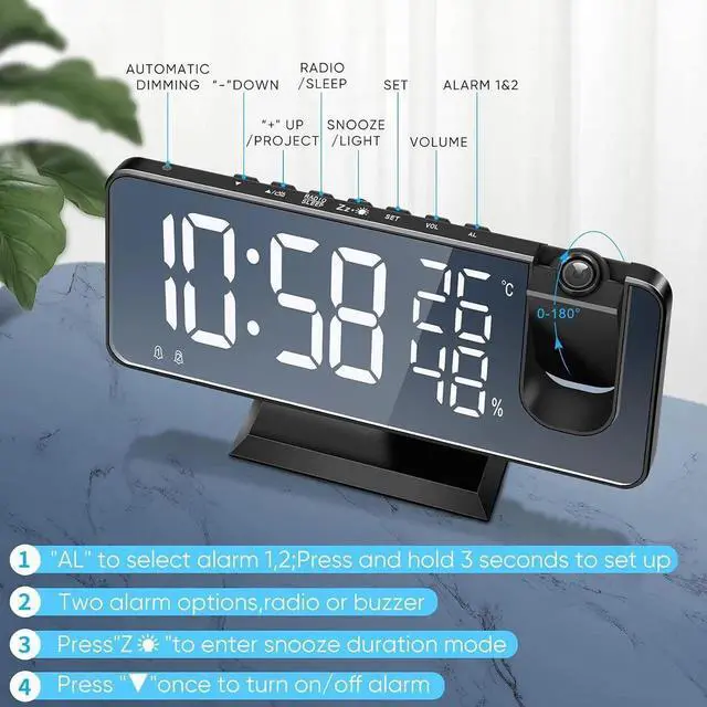 1:180 ° Projector Alarm Clock - Wonderful clock for your bedroom. 180° adjustable projector (-90° to 90°), 7.3 ''ultra-large LED display projection alarm clock, you can easily read the time on ceiling while lying in bed. And our digital alarm clock equipped with a high sensitivity sensor which can adjust the display brightness, it will not disturb you or your kids sleeping.