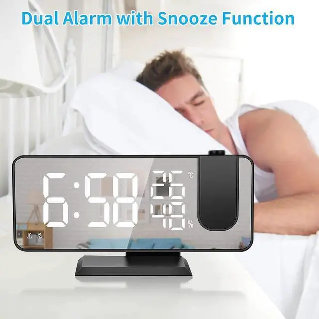 3: Dual Alarms with Snooze Function - Our loud electronic digital ceiling clock projector for bedroom has two separate alarms design which could wake you and your companion up at different alarm time setting, or double waking-up service for you only. Press the big SNOOZE button at the top to get extra precious 6 minutes sleep till next loop of the alarm.