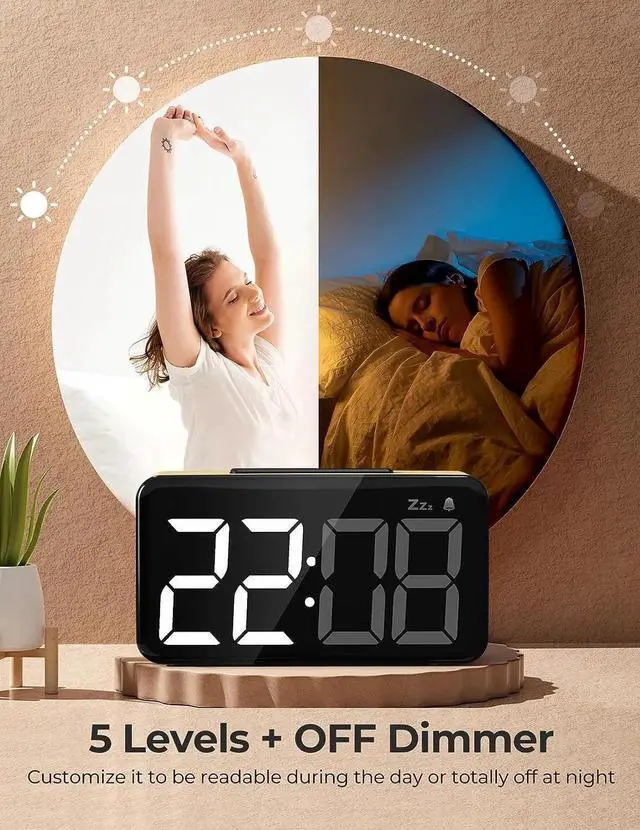 5-LEVEL DIMMABLE AND OFFToo bright to disturb your sleep at night? Or can't see the time in the daytime because the light is too bright? This led clock comes with 5-Level of brightness adjustment and full darkness mode. The bedside clock's clearly LED digital display and brightness can be freely adjusted from bright to full darkness to meet the needs of light-sensitive people to see the time throughout the day.